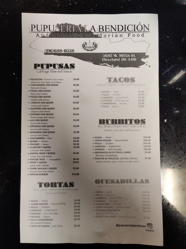 Welcome to Pupuseria La Bendicion, a culinary gem nestled in Cleveland, OH, at 3685 W 105th St. This establishment proudly offers a taste of authentic Salvadoran cuisine, specializing in delicious pupusas—corn tortillas stuffed with mouthwatering fillings like chicken, beef, and cheese. Customers rave about the generous portions, with reviews highlighting the freshness and flavor of each dish.